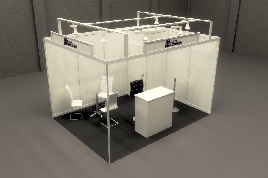 | Normstand COMPLETE Teppich Trennwände Zargenblende Versperrbare Koje 1 x 1 m je 1 Schriftblende pro Gangseite inkl. Druck Weißlichtstrahler auf einem erhöhten Raster 1 Bistrotisch mit Glasplatte D=70 cm 3 Schwingsessel weiß mit Chromfuß 1 Stehtisch mit weißer Platte 1 Barpult mit Zwischfach (103 x 53 x H110 cm) Das Komplettpaket für Ihren Messeauftritt |  | |